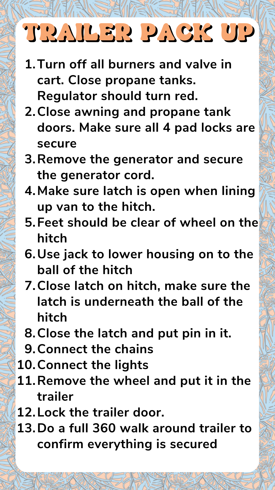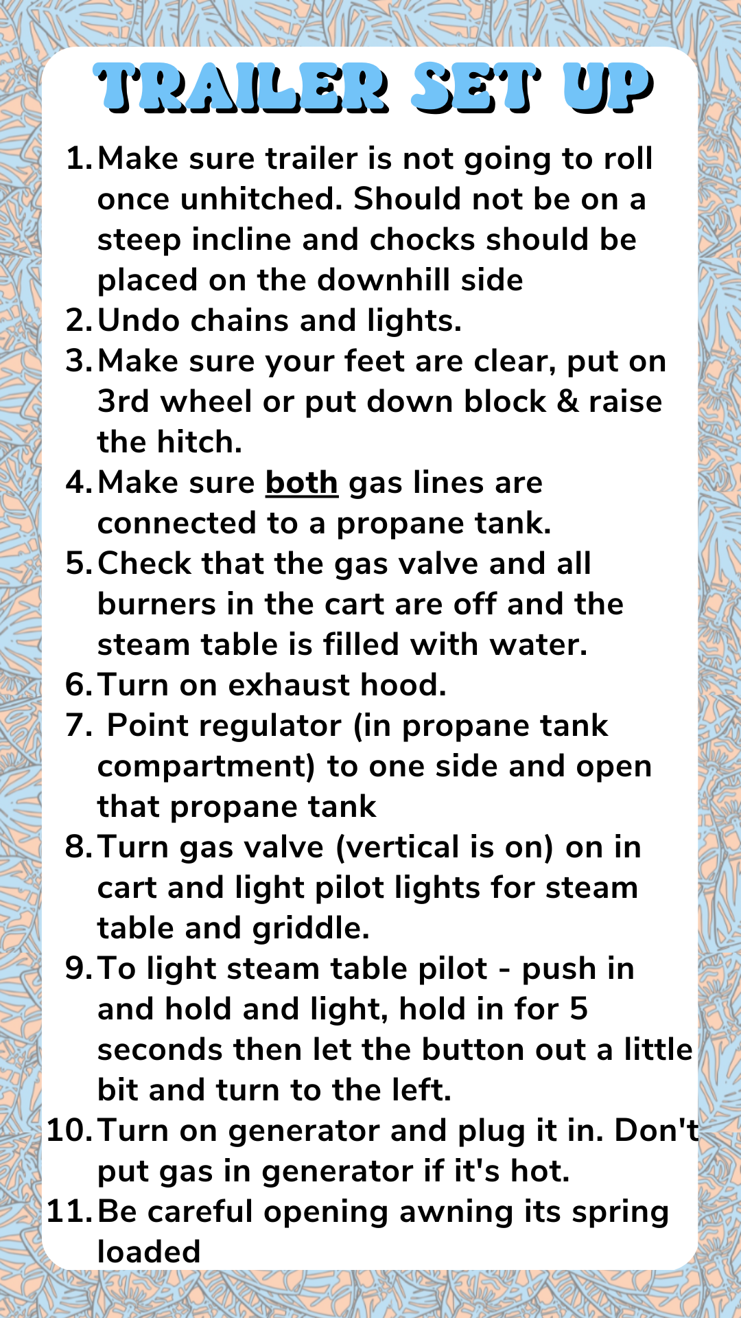 This is all about the trailer. No food or customer set up involved. That will be covered in another SOP.