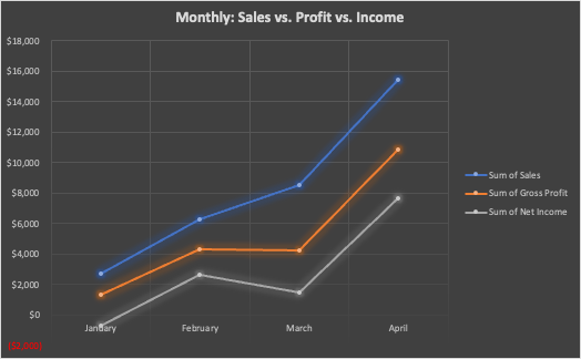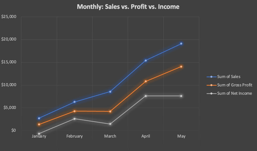 - After adding May to the mix the April sales and profit jump doesn't look as sharp.