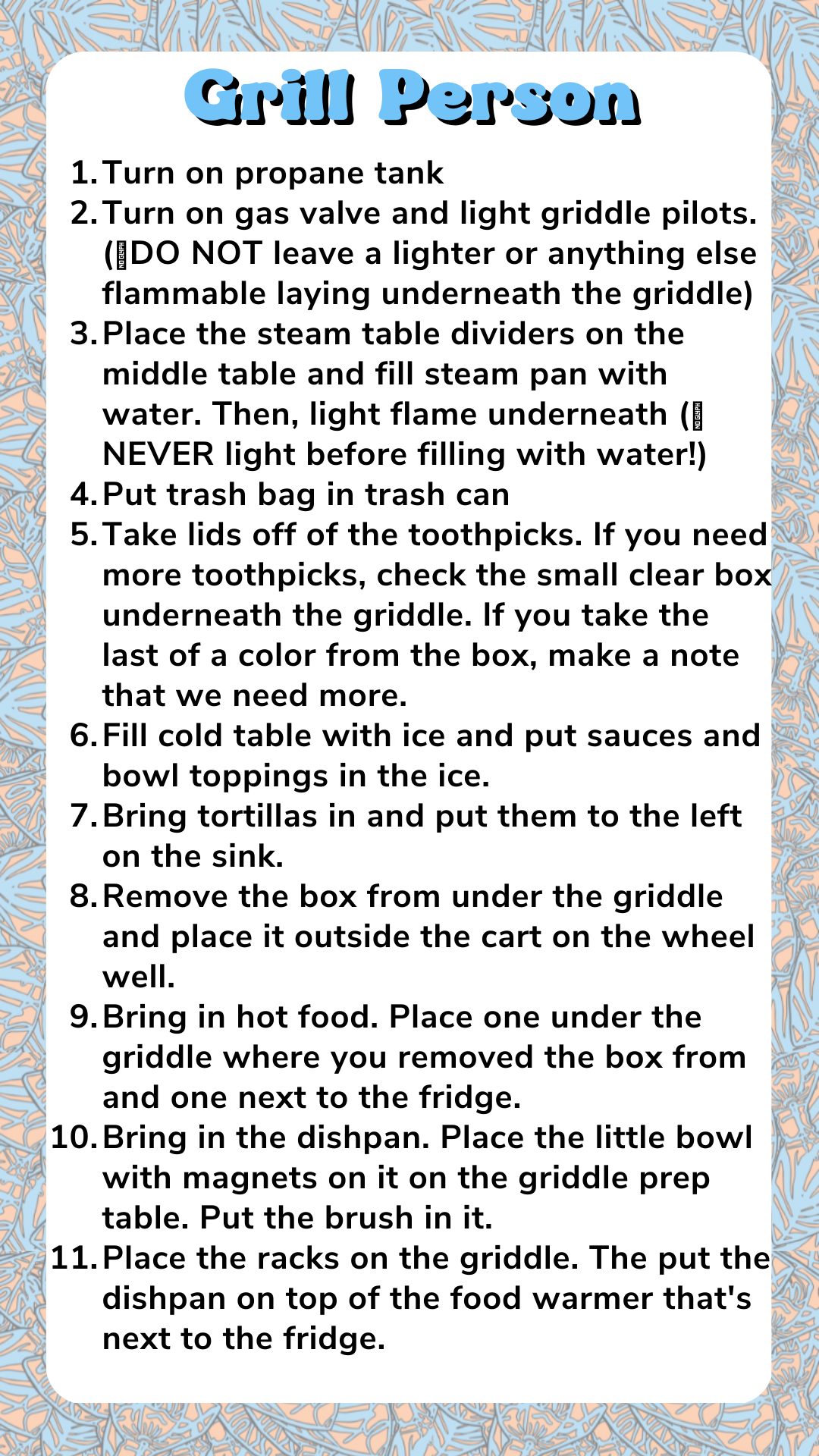 This post covers how to get the ready to serve up some banging taquitos, tacos and bowls. There will be another post that will deal with setting up the tent and taco cart set up. This post is strictly for the trailer! There's no food or customer set up involved either. That will be covered in another SOP.