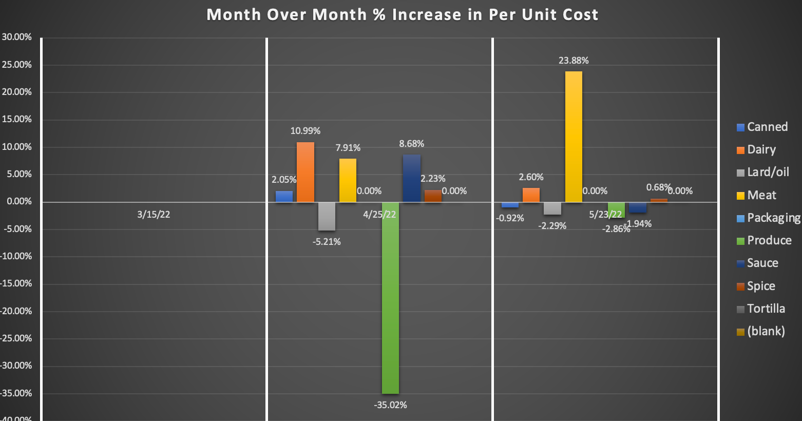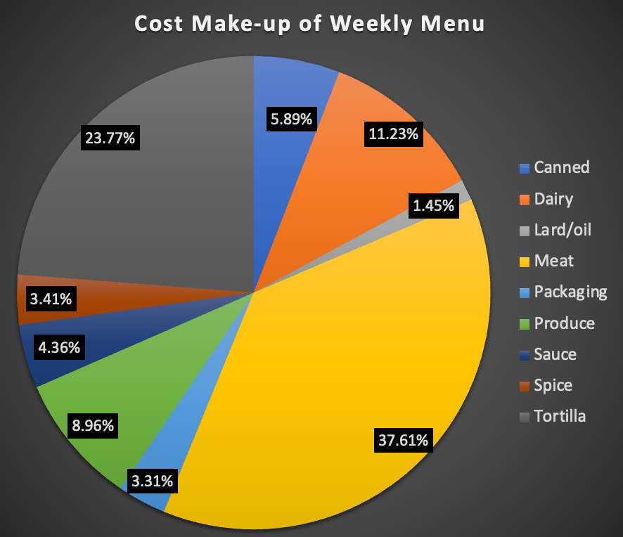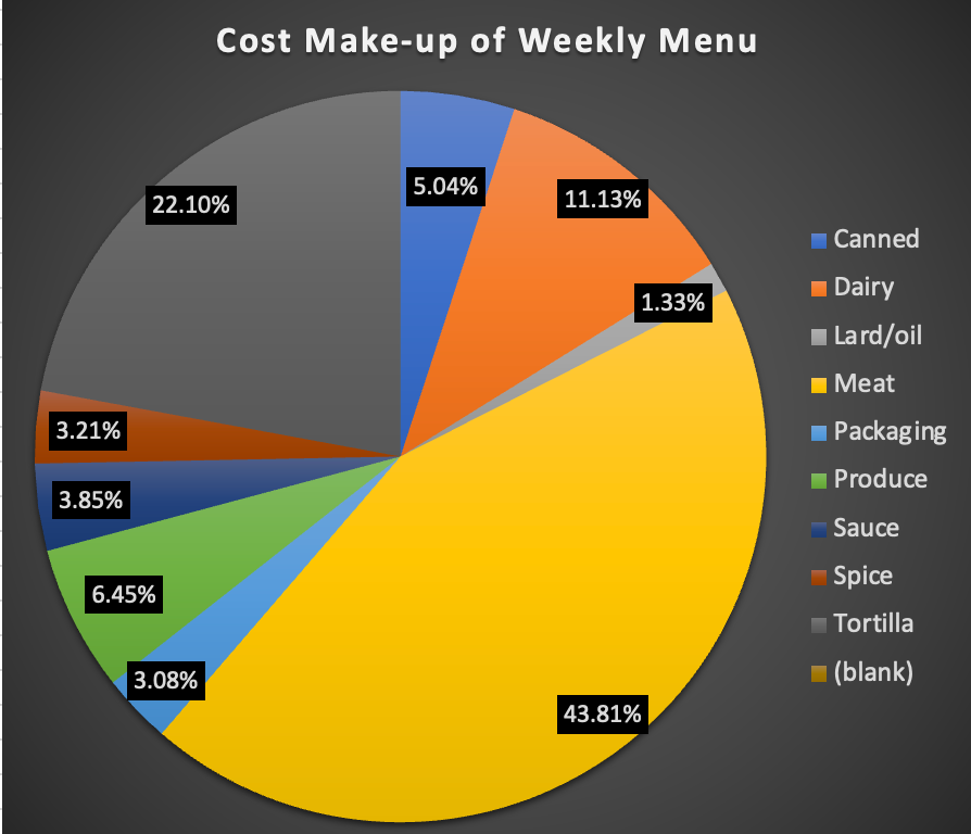 After no price increase in our chicken over 6 months, it jumped 10% this morning. At 8% meat isn't the top mover but as you'll see below our meat makes up 38% of the total cost of our menu, so it increasing hurts us more than increases in dairy or sauces.