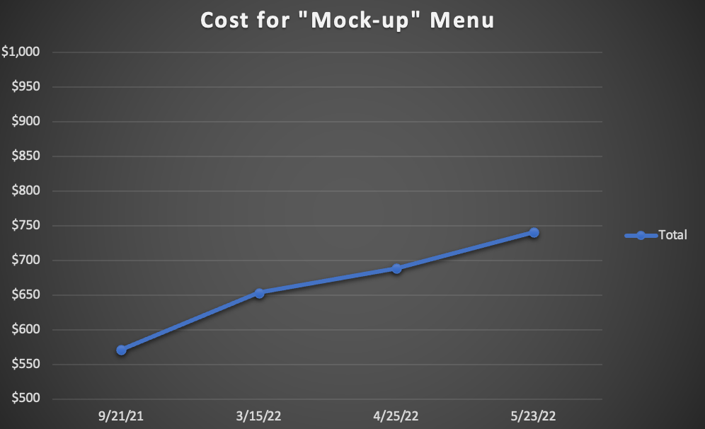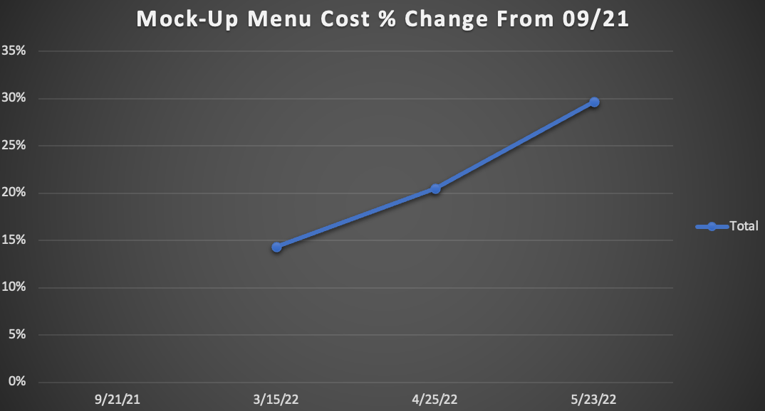 Here is the % increase of the "Mock-up" Menu. With today's prices our menu is almost 30% more expensive than it would have been in September.