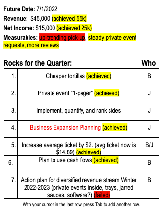 Another goal revolving around the new food cart. Double booking events means hiring. But first, we need to know what that new hire's schedule will look like. This goal is involved so a detailed plan is key.