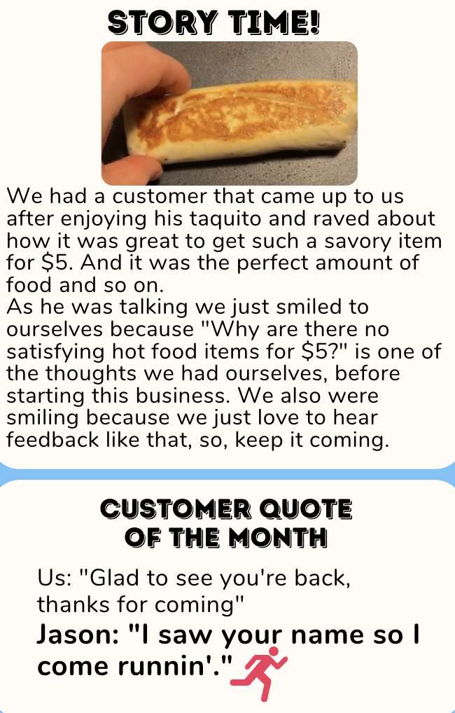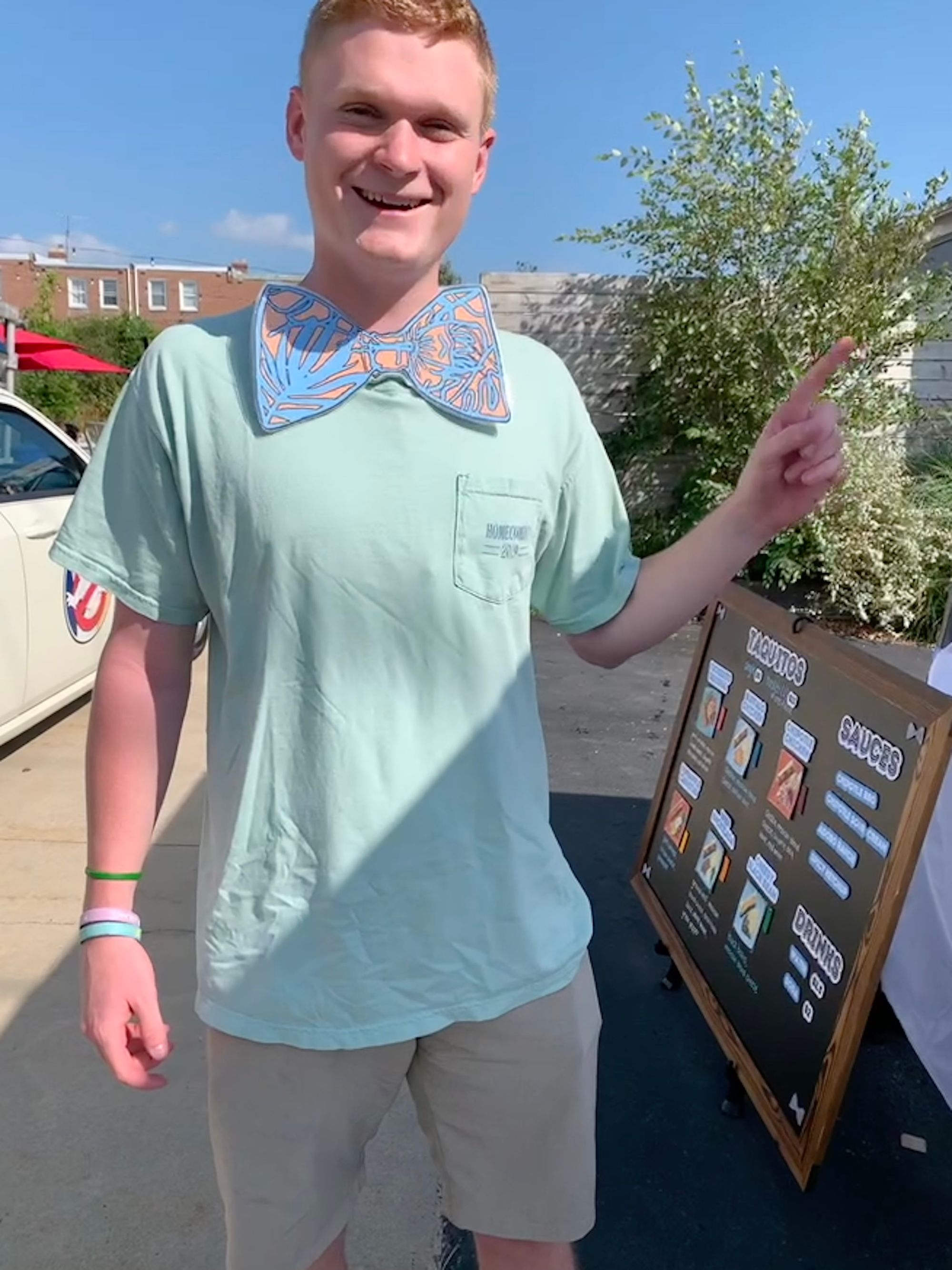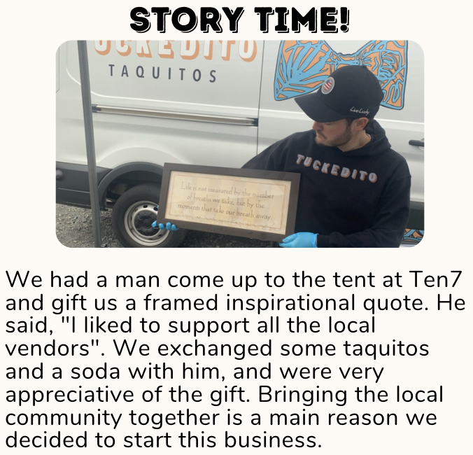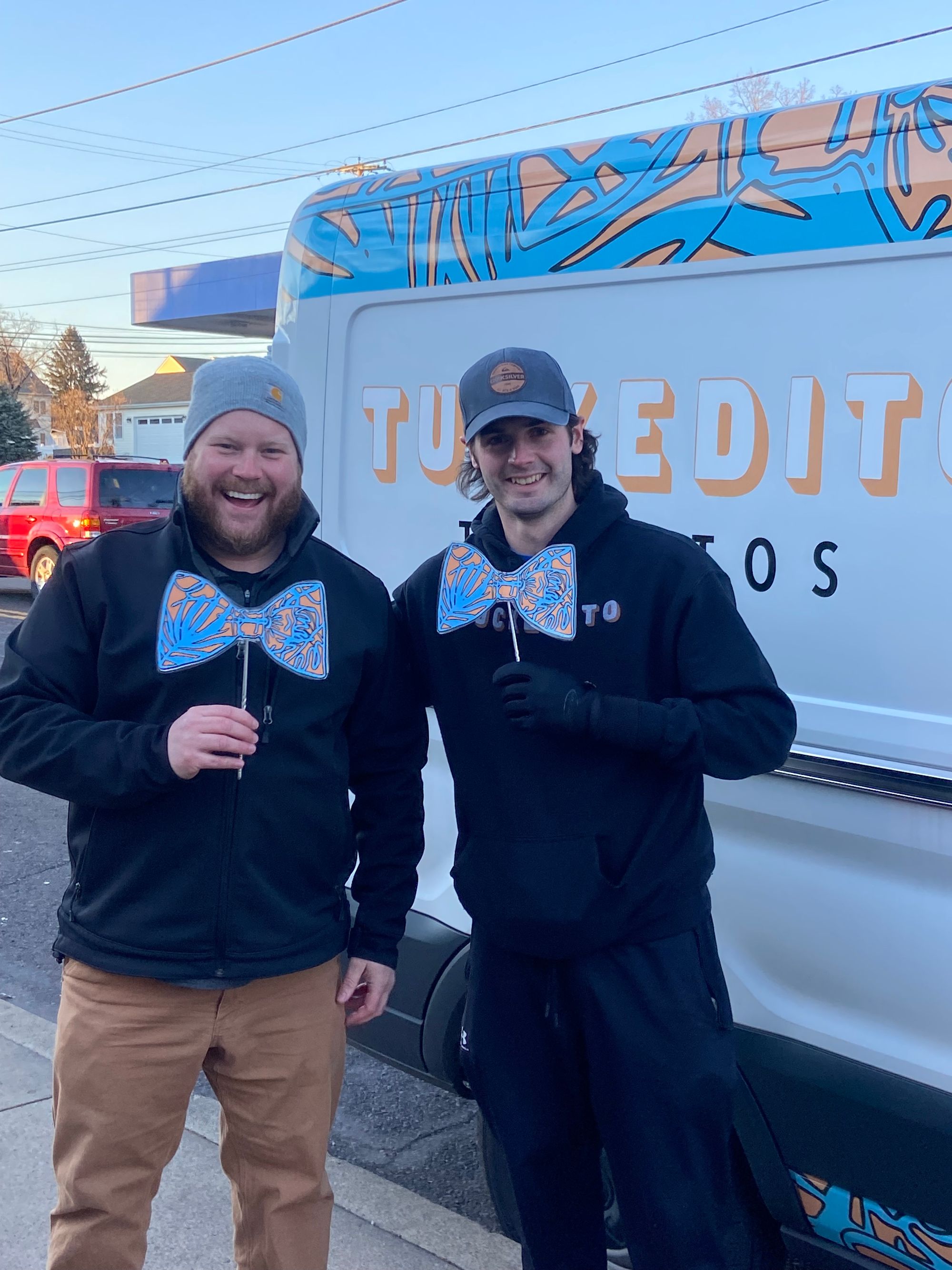 We went through what we wanted TUCKEDito to represent, other than the food. Good vibes came to us pretty quickly. It's represented in our bright colors, bow tie logo, and most importantly our attitudes. We just wanted to greet people with happiness and pass on that good vibes feeling.